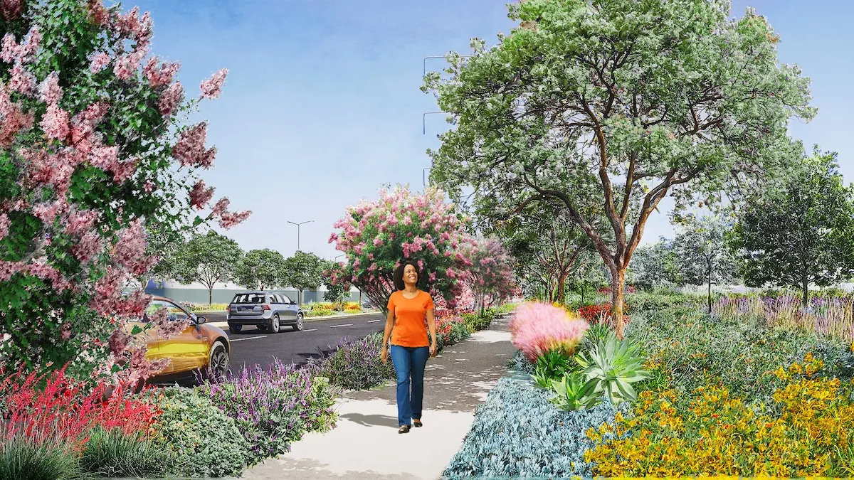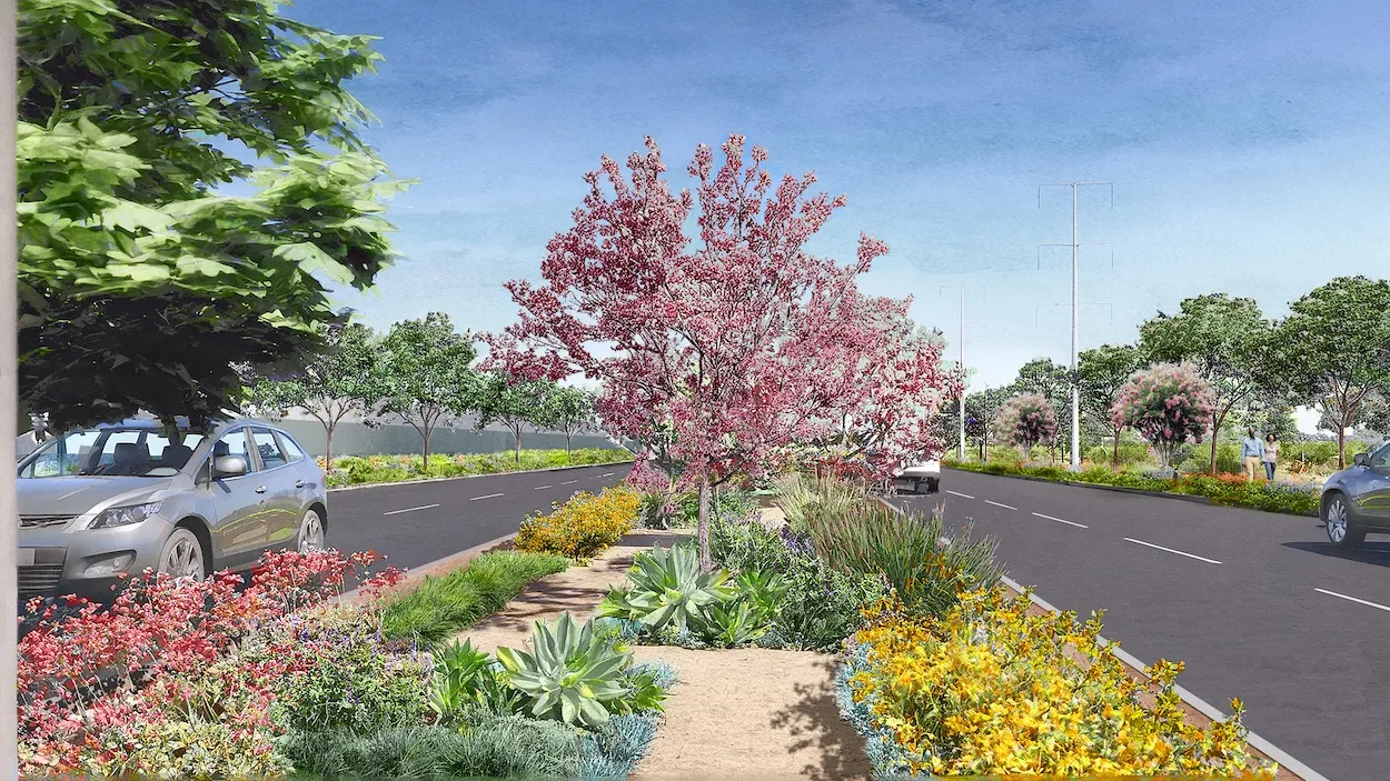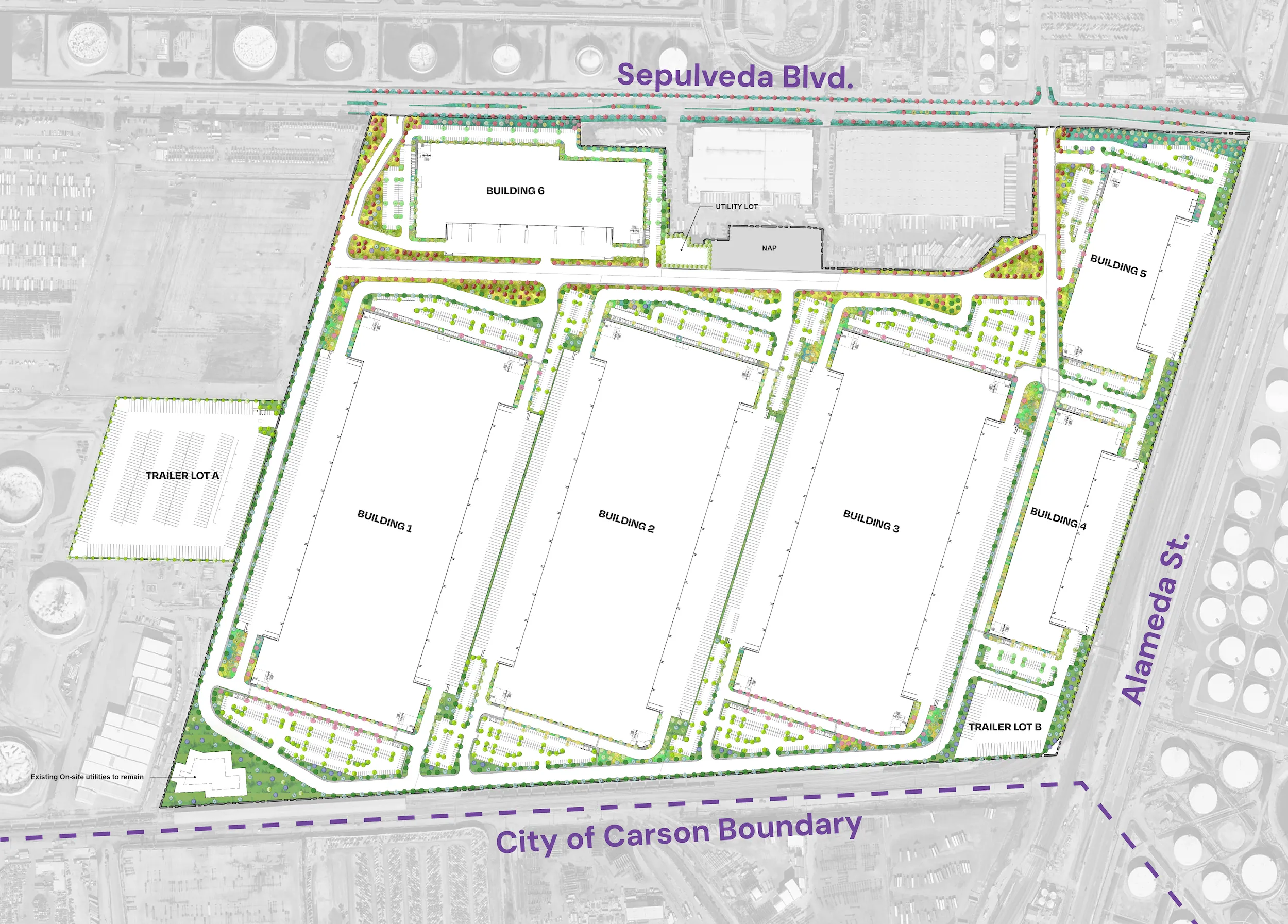 Extensive new landscaping will be planted on both sides of Sepulveda Boulevard, and within the existing roadway median. New trees and plants within the project site will green this legacy industrial site.